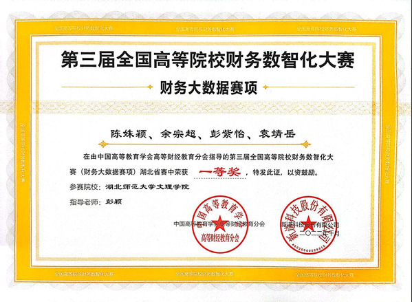 本网讯(通讯员 渣梦丽)10月8日,2022年湖北省第三届全国高等院校财务数智化大赛圆满落幕,mksports在线登录_mk(中国)一站式服务体育经济与管理学部财务管理专业由陈姝颖、余宗超、彭紫怡、袁靖岳同学组成的团队获得一等奖,指导教师为彭颖。由邵雅琦、周梦婷、黄羽轩、董婷同学组成的团队在袁家健老师的指导下获得三等奖。