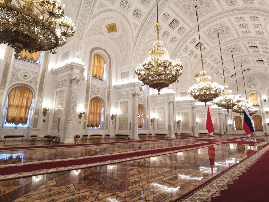 在雄壮激昂的迎宾曲中,习近平主席和普京总统分别从乔治大厅两侧沿红地毯阔步走入大厅中央。