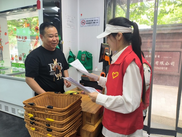 湖师大文理学院的志愿者则“兵分两路”,一组志愿者向居民群众讲解在日常生活中如何清楚辨别和抵御各类非法出版物、文化垃圾等内容,增强安全防范意识和法治意识;另一组则和社区工作人员一道,对沿街商户进行反电诈、文明创建知识等宣传。