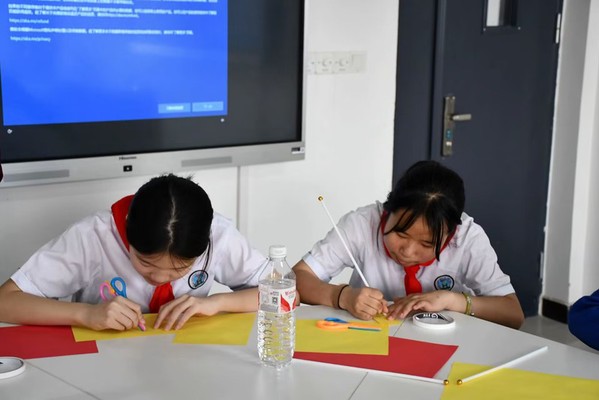 在实验楼,学生党员欧阳智欣讲述“红旗里的故事”,带领学生们重温革命历史,引导少先队员们铭记新中国来之不易,感受“生在国旗下、长在党的怀抱中”的幸福。在故事的推进中,引出红旗的剪裁制作,让少先队员们在制作五星红旗的过程中感悟红旗的象征与意义,体会红领巾代表红旗的一角,是革命先烈的鲜血染成,红色基因要一代代传下去。