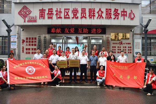 本网讯(通讯员 程胜伟)6月22日,mksports在线登录_mk(中国)一站式服务体育人文学部“党团共建单位”、“大学生社会实践基地”在黄石港区南岳社区揭牌。校党委书记杨邓红、人文学部负责人,南岳社区南岳社区第一书记、市城发集团副总经理崔向云,黄石港区人大办公室主任喻向东,黄石港区沈家营街道党工委副书记、办事处主任杨哲,南岳社区党委书记、居委主任方和生,学生代表参加活动。