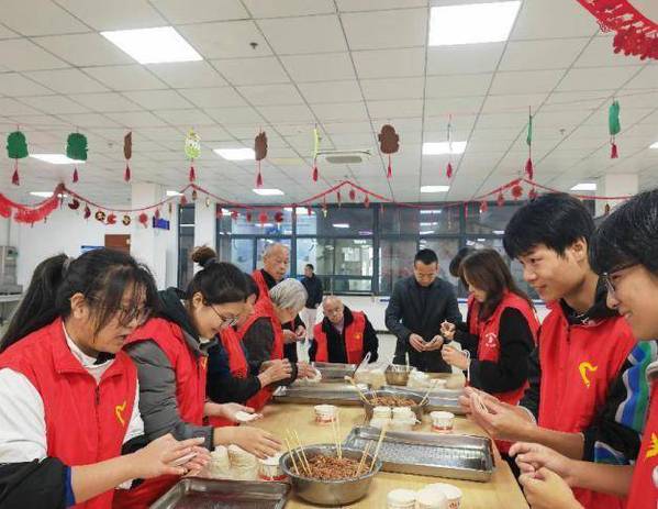 手势舞结束后,社区工作人员、文理学院学生志愿者及福利院后勤人员围坐在一起为孤寡老人包饺子,不少老人也纷纷表示:“我也要包,好久没有包过饺子了”“今天真开心,这么多人一起包饺子,像回到了以前家里一家人包饺子的样子”,也有学生志愿者说“哇,这是我第一次包饺子,原来包饺子一点不难啊”,现场气氛热烈而融洽,一盘盘形态各异的饺子也映入眼帘。