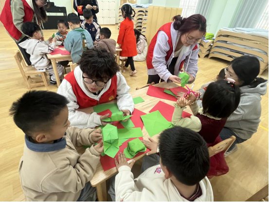在幼儿园活动室,大学生志愿者小王站在桌前,手里捧着一叠彩纸,正耐心教围坐在桌旁的幼儿园小朋友们折雷锋帽。孩子们好奇地盯着她的手指,小声念叨着步骤:“先对折,再翻转……”9 岁的欣欣举着皱巴巴的纸片,奶声奶气地问:“姐姐,雷锋叔叔的帽子为什么是这个样子的呀?” 小王笑着回答:“因为雷锋叔叔总是把最好的留给别人,这顶帽子就像他心里装着大家一样!” 话音未落,6 岁的萌萌突然举手:“我见过五角星!是国旗上的星星!” 她踮起脚尖,用彩笔在帽子顶端画了一个歪歪扭扭的五角星。其他小朋友也纷纷效仿,拿起画笔画了起来。