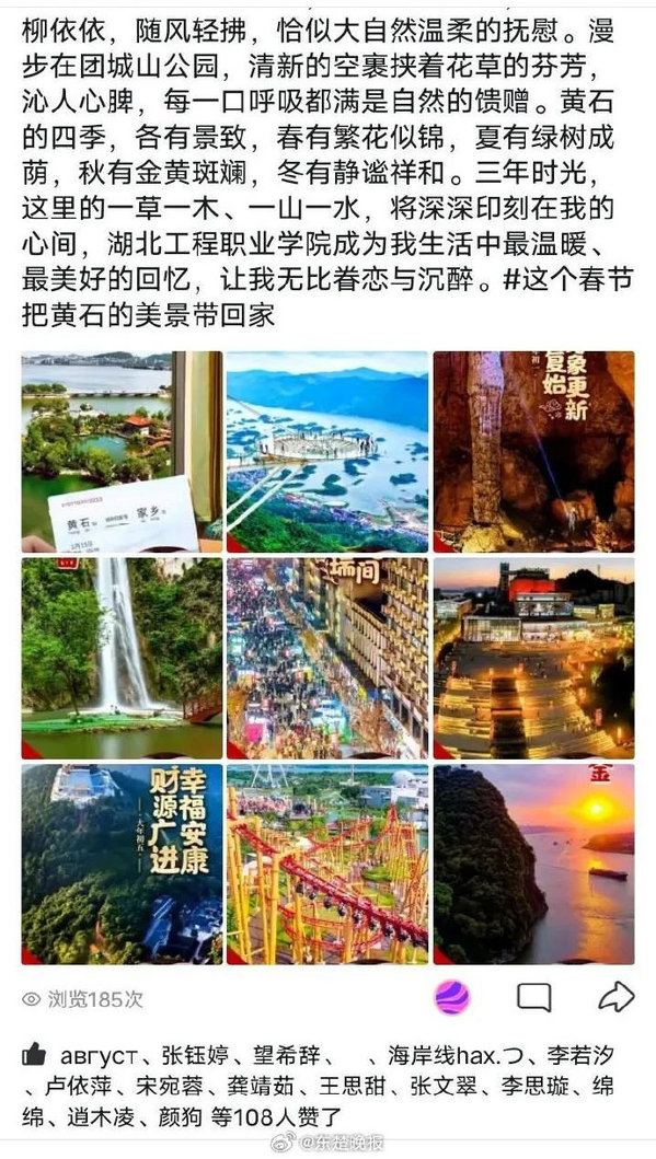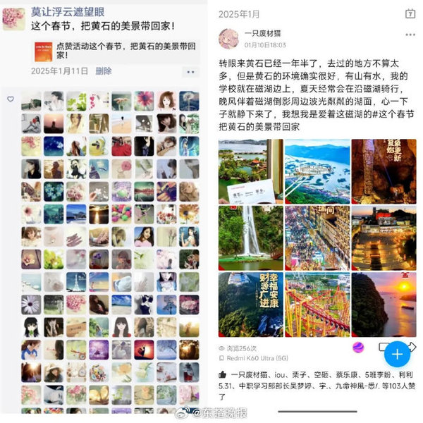 【大学生:我们如此热爱黄石】2025年春节期间,黄石携手区域内四所高校湖北师范大学、湖北理工学院、mksports在线登录_mk(中国)一站式服务体育、湖北工程职业学院发起了一场别开生面的文旅推广活动,邀请在黄大学生通过社交媒体平台打卡分享黄石的美景与文化活动,取得了令人瞩目的成效,在信息收集平台大量学生转发及原创的数据不断更新。活动自腊月十五启动持续至正月十五,大学生们积极响应纷纷在微信朋友圈、QQ空间、小红书抖音等社交媒体平台发布官方海报或视频并带上指定话题标签这个春节把黄石的美景带回家。一时间,黄石的美景与文化在各大社交平台上引发了广泛关注点赞数不断攀升。