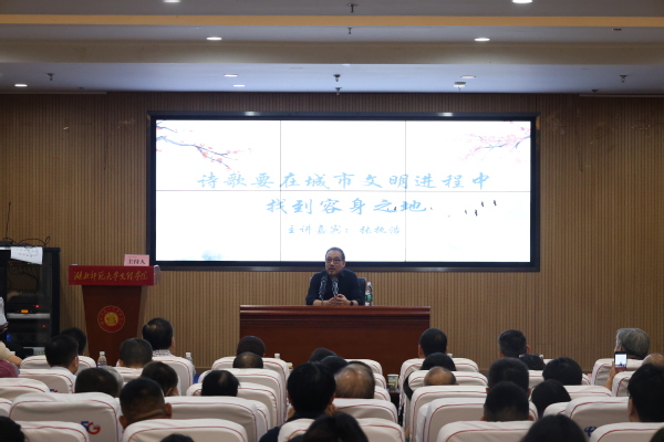 著名诗人张执浩以“诗歌要在城市文明进程中找到容身之地”为题展开讲座。他从中国农耕文化的深厚底蕴出发,分析了诗歌作为文化载体在不同历史阶段的精神使命,并以武汉为例,强调深入感知地域文化对创作的重要性。