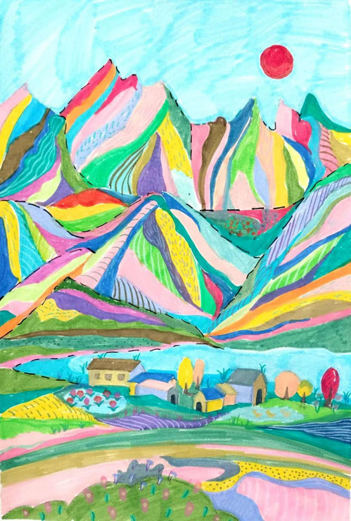抬眼望去,连绵的山峦是这幅画的主角。春天将它们染上了五彩斑斓的色彩,仿佛是大自然打翻了调色盘。红的、黄的、绿的、粉的……各种颜色交织缠绕,似是在诉说着春日的蓬勃与热烈。那层层叠叠的色彩,像是山峦在春日里新披的霓裳,随着山势起伏,宛如灵动的彩绸,在微风中轻轻舞动。