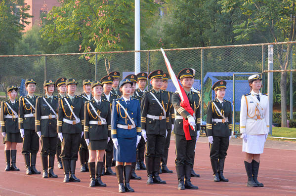 早6:50,“出旗!”伴随着洪亮的号令,校国旗护卫队踏着坚定的步伐、整齐划一地护卫着鲜红的国旗迈向升旗台。“升国旗、奏唱国歌”,全场师生庄严站立在田径运动场,鲜红的五星红旗冉冉升起,伴着国歌声升至旗杆顶端。下半旗致哀,全场默哀,祭奠抗日战争期间遇难同胞。