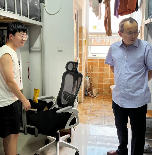 检查以安全为重点,查看了食品安全、消防疏散通道、消防设施器材;检查了学生是否存在违规使用大功率电器、是否在宿舍饲养宠物等情况。并对2022级新生进行了亲切的看望,提醒同学们遵守疫情防控要求,严格落实非必要不外出规定,如果有事外出要做好请假,并做好安全防护措施,同时对同学们进行了防范电信网络诈骗、交通安全等知识教育。
