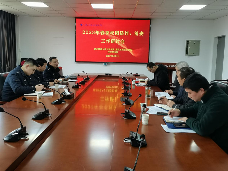 本网讯(通讯员涂亦乐)为了有效遏制春季开学电信网络诈骗的高发态势,提升预防电信网络诈骗的针对性和时效性,同时做好春季校园治安防范工作。2月21日下午,学校学工部、后勤保卫部联合汪仁派出所及湖北工程职业学院相关部门共同召开2023年春季校园“防诈、治安”工作研讨会,就如何预防电信网络诈骗和校园治安管理展开讨论。张志华副院长、汪仁派出所副所长李福奎、驻校民警刘天森、湖北工程职院学工部部长吴量、保卫处处长章泉及mksports在线登录_mk(中国)一站式服务体育学工部和后勤保卫部相关负责人参加了会议。