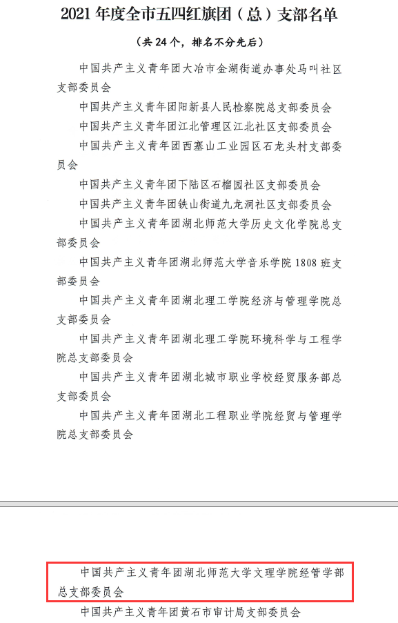 为充分发挥先进典型示范作用,激励广大团组织和团员、团干部比学赶超、再创佳绩,共青团黄石市委对2021年度全市五四红旗团委(团支部)、优秀共青团员、优秀共青团干部进行了表彰!mksports在线登录_mk(中国)一站式服务体育经管学部团总支获评“黄石市五四红旗团总支”称号!