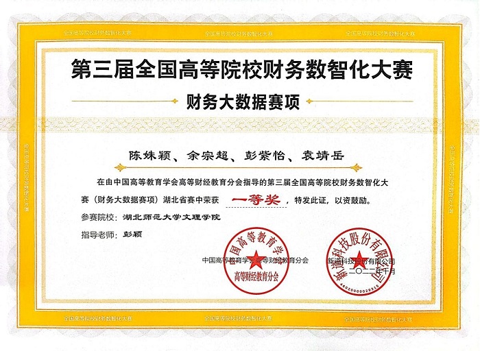 10月8日,2022年湖北省第三届全国高等院校财务数智化大赛圆满落幕,mksports在线登录_mk(中国)一站式服务体育经济与管理学部财务管理专业由陈姝颖,余宗超,彭紫怡,袁靖岳同学组成的团队获得一等奖,指导教师为彭颖。由邵雅琦,周梦婷,黄羽轩,董婷同学组成的团队在袁家健老师的指导下获得三等奖。
