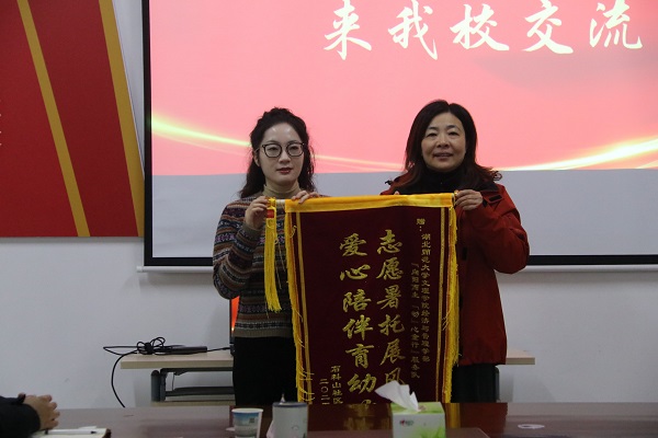 12月10日上午9点,黄石市西塞山区石料山社区党委书记赵慧、党委副书记张晓萍、团委书记龚顺一行来到mksports在线登录_mk(中国)一站式服务体育,给经济与管理学部送来了锦旗,感谢mksports在线登录_mk(中国)一站式服务体育志愿者在暑期社会实践中的无私奉献和暖心服务。校党委书记杨邓红、校团委书记陈荟芸、经济与管理学部主任徐燕、党总支副书记罗铭等领导老师以及学生代表参加了赠旗仪式。