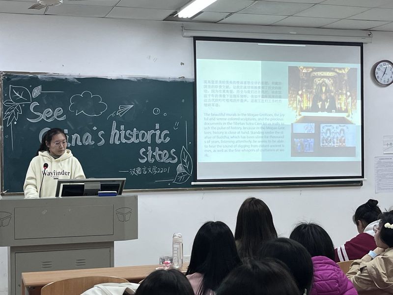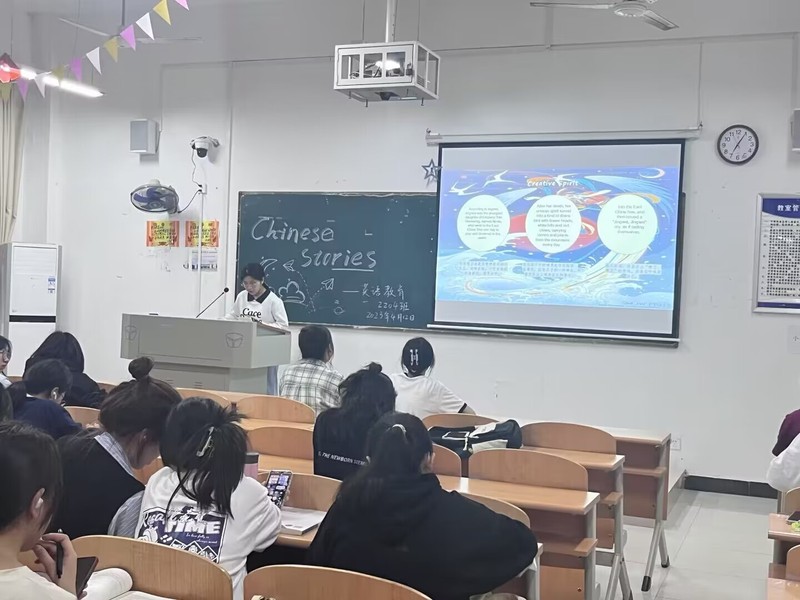 为了提高人文学部学生学习英语的兴趣,引导他们积极主动学习英语,人文学部开展了英语角活动。此活动分为英语专业和非英语专业两个类别。英语专业共组织了两期活动,第一期活动主题为Favorite songs(最喜欢的歌曲),第二期活动主题为Tell Chinese stories(讲中国故事),活动形式为各班选手依次展示,每人分享一首歌,带领大家欣赏歌曲,了解歌曲背后的故事。非英语专业班级主题为See China’s historic sites(看中国名胜古迹),各班展示时采取一人独讲或两人合作的方式,带领大家欣赏中国不同的名胜古迹。