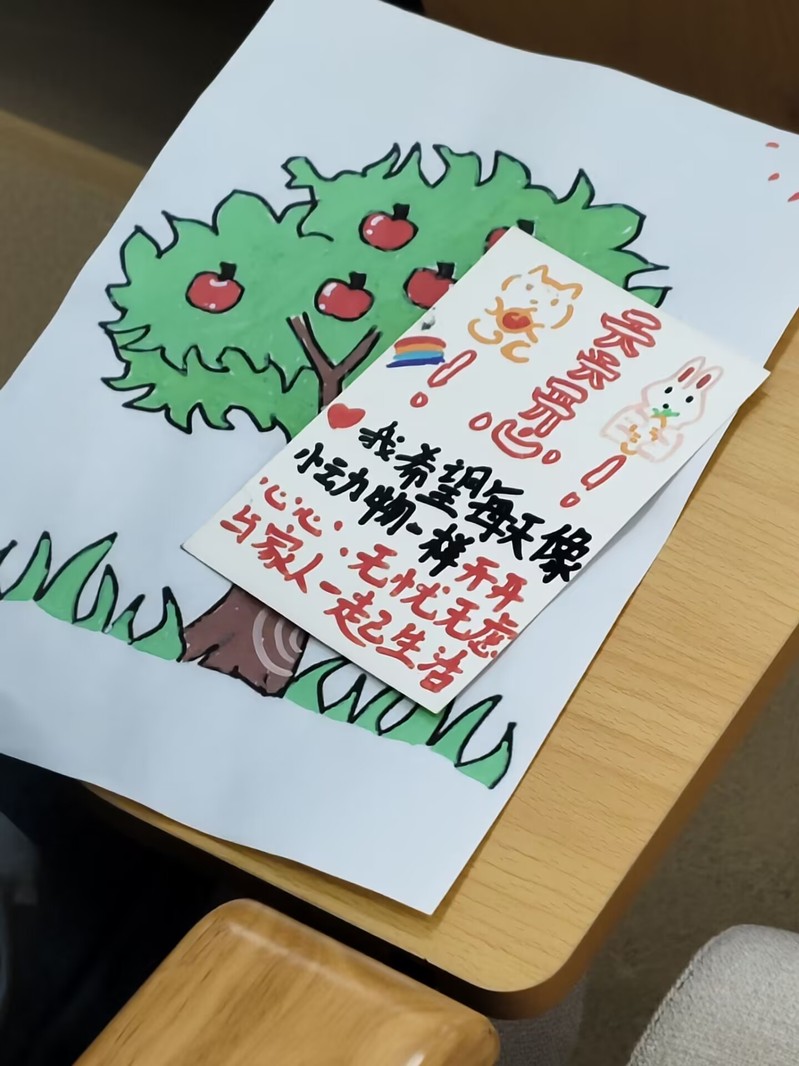 在“心声传递”活动环节,孩子们写下了自己对父母的思念与祝福,并通过小卡片传递内心的情感。“我希望爸爸妈妈可以平平安安,健健康康”,这些简单而真挚的字句透露出孩子们对家庭的深切牵挂和期盼。通过这一环节,孩子们不仅表达了情感,还在志愿者的鼓励下增强了与父母的沟通和联系。