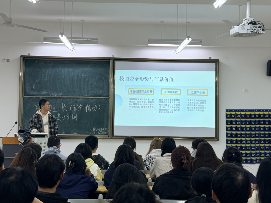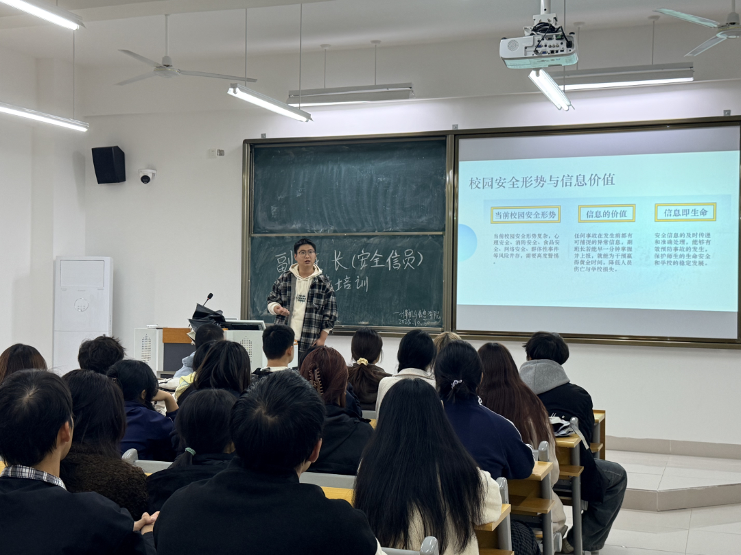 为深入落实学校关于学生安全信息员工作的部署要求,进一步健全班级安全管理体系,切实提升学生安全防范意识与应急处置能力,mksports在线登录_mk(中国)一站式服务体育计算机与信息学院于2025年10月30日在J3教学楼203教室举办“副班长(安全信息员)专题培训”。本次培训由学院辅导员余纯斌主讲,学院全体班级副班长参加。
