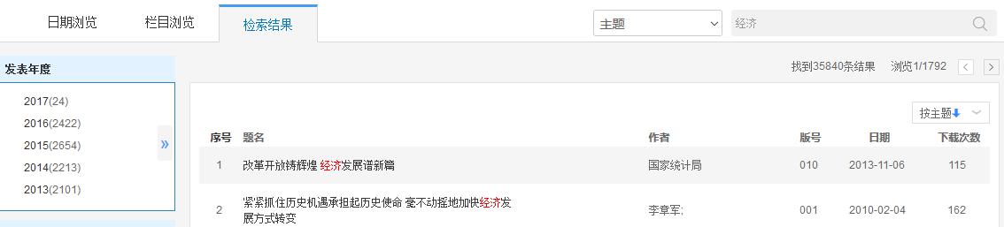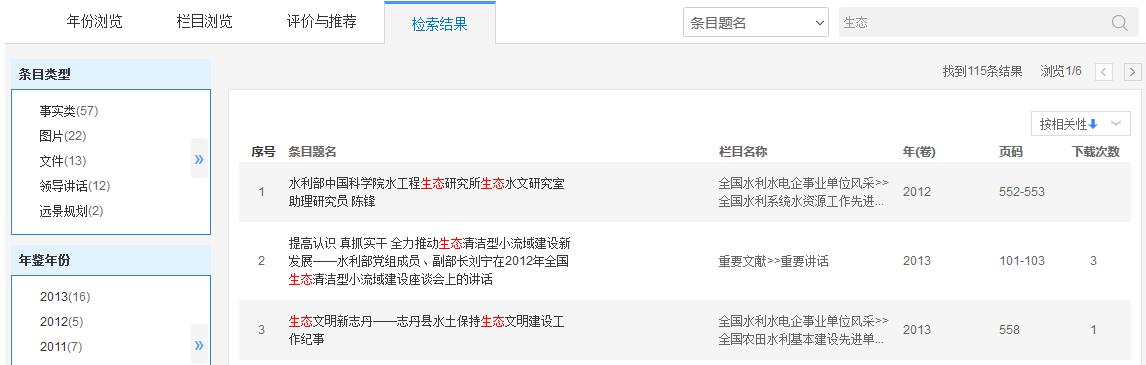 如图5.8.6.3所示,左侧默认展示该年鉴的一级栏目信息。右侧为该栏目下的条目列表,包括条目题名、栏目名称、年(卷)、页码、下载次数。同时可以筛选条目类型,如文件、统计图表、事实类、机构、法律法规等类型。默认按照相关性排序,还可以按年鉴年份、按下载次数排序。点击题名,可进入相应条目知网节;鼠标悬停到某篇文献,点击按钮可下载(登录后)、在线预览、分享该篇文献。