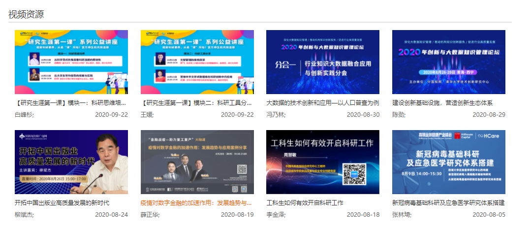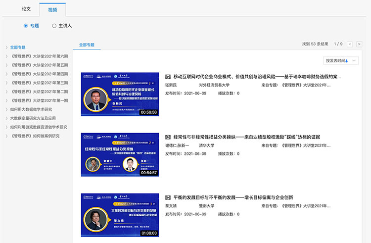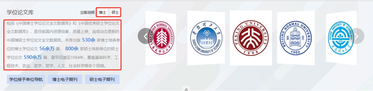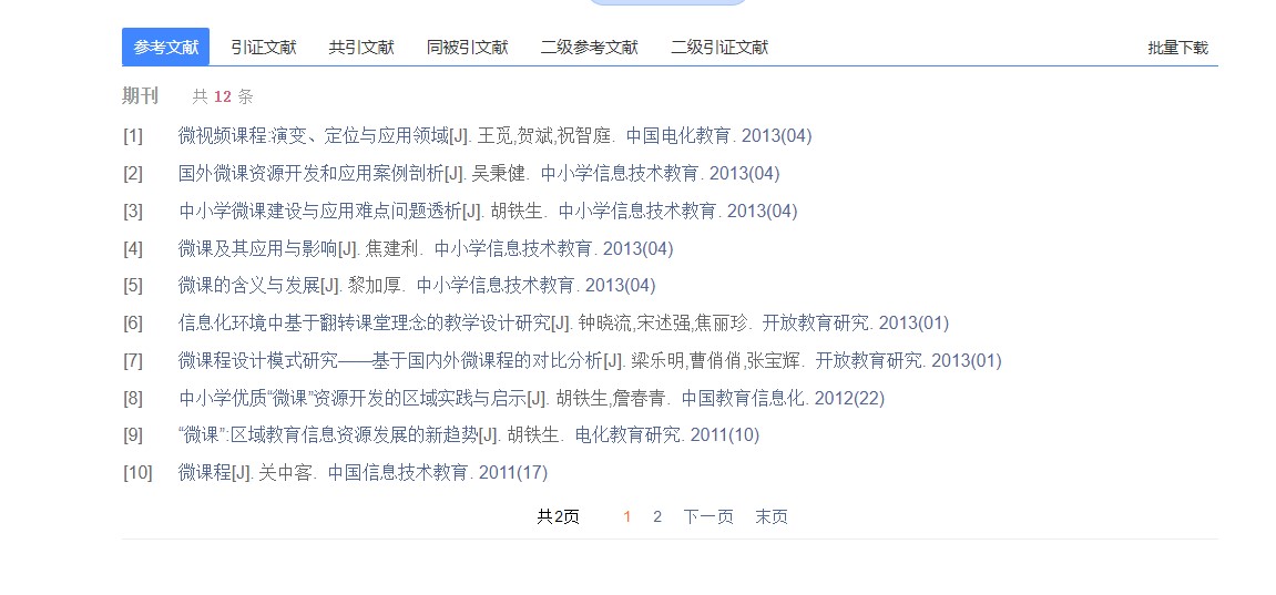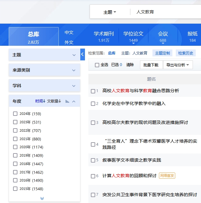 总库检索后,点击各资源类型名称,下方的检索结果区即为该资源类型文献。