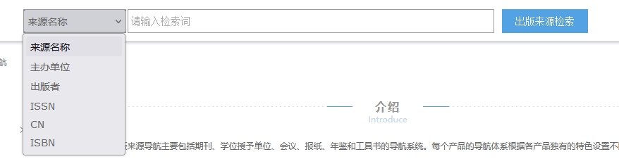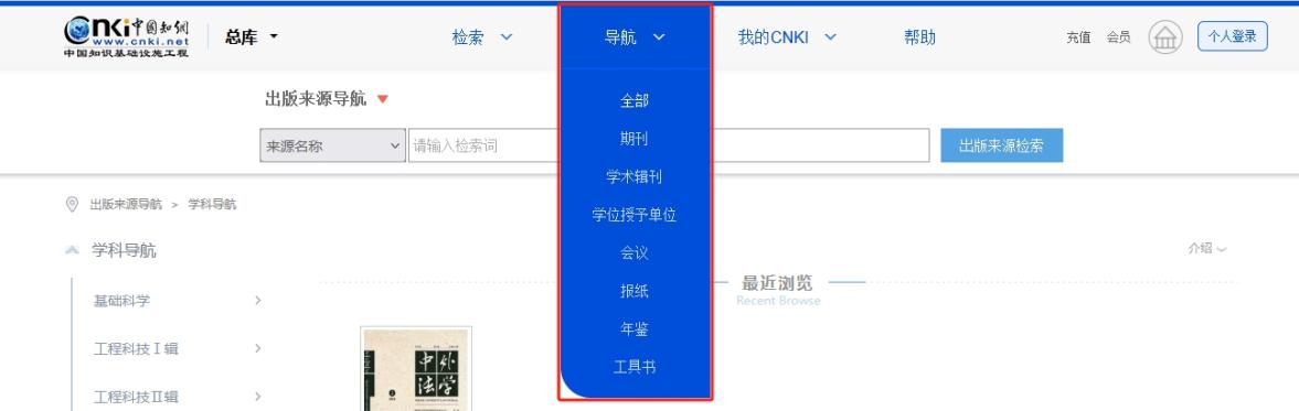 鼠标移入页头“导航”,显示各出版来源导航,点击进入相对应导航页面。
