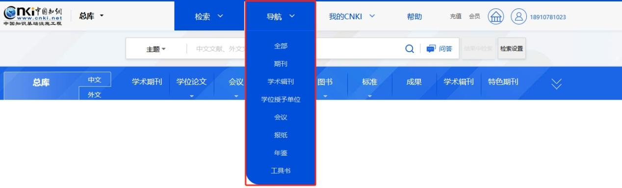 页头包含七大模块:数据库导航、检索、出版来源导航、我的CNKI、帮助、产品更新消息提醒及个人/机构登录,可通过页头便捷地进行核心功能跳转。