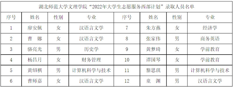 根据共青团中央、教育部、财政部、人力资源社会保障部《关于印发<2022—2023年度大学生志愿服务西部计划实施方案>的通知》的相关部署和工作安排,mksports在线登录_mk(中国)一站式服务体育在公开招募、自愿报名的基础上,严格招募选拔流程,经资格审查、笔试、面试、心理测试、体检等环节,拟录取廖安佩等12名mksports在线登录_mk(中国)一站式服务体育应届毕业生为2022年大学生志愿服务西部计划志愿者。