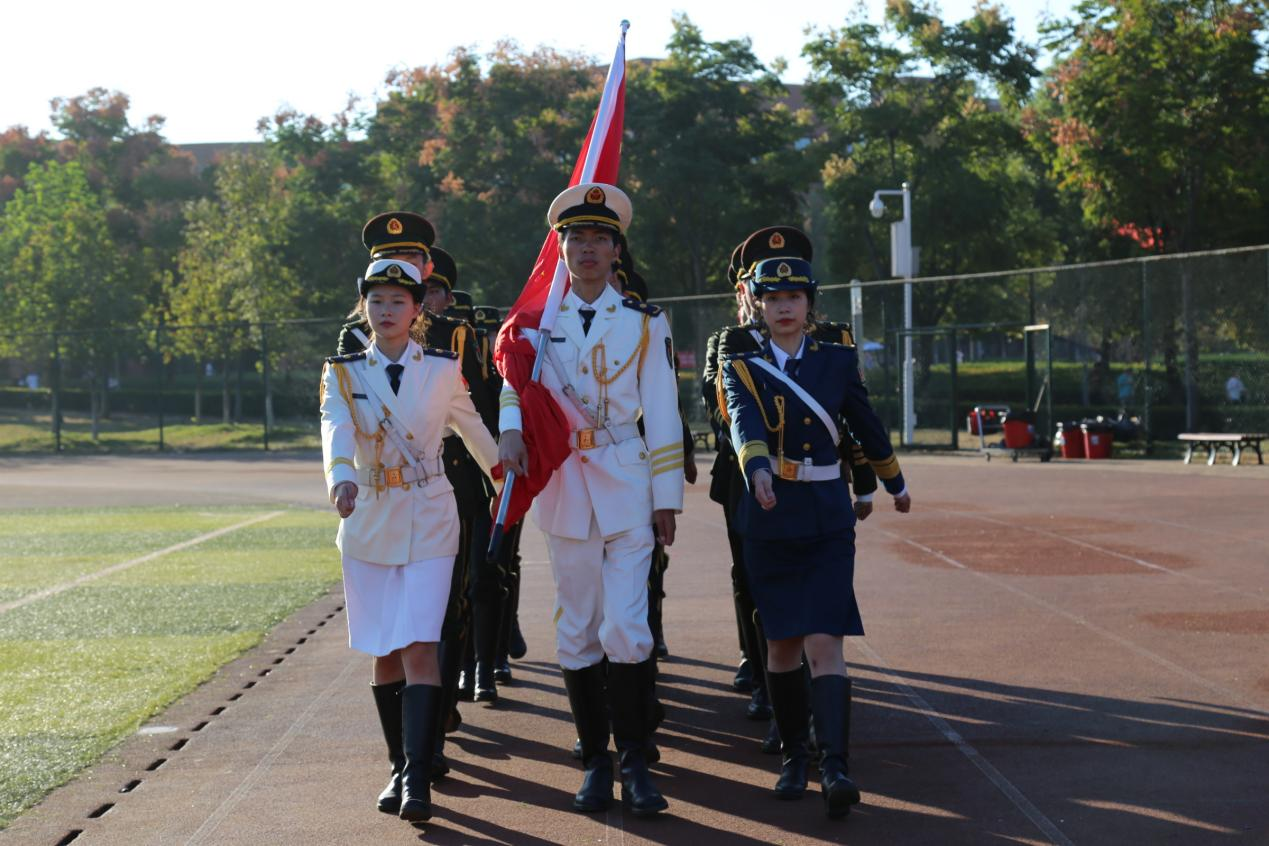 6点45分,一声响亮的“出旗”,旗手们迈着整齐划一的步伐,走向升旗台,全校师生肃立注目,奏唱国歌,五星红旗冉冉升起。随后校级团学干部进行《祖国颂》诗歌朗诵,他们热情饱满,高声诵出对祖国的热爱,手中挥动的小红旗洋溢着青年学子驿动的青春和坚定的信念。