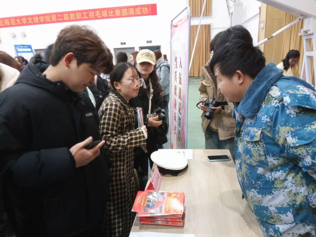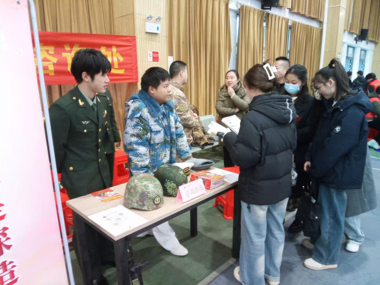 本网讯(通讯员:朱明敏)为扎实做好2025年春季征兵工作,激发广大毕业生参军热情,2024年12月11日上午,于mksports在线登录_mk(中国)一站式服务体育风雨操场二楼开展2024年秋季征兵宣传进招聘会活动,参会人员武装部干事熊琦,学工部副部长陈小龙,征兵办老师秦雯雯,以及各退役大学生。