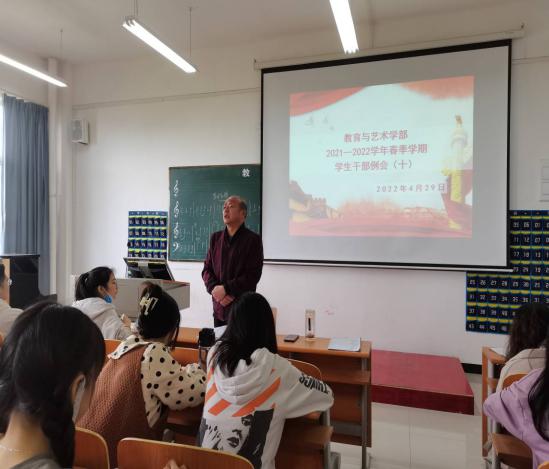 2022年4月29日中午12:00,教育与艺术学部按照惯例在实验楼1-403教室组织召开学生干部工作例会。辅导员、团学会干部及各专业班级的负责人入会。会议由总支书记李先华主持。