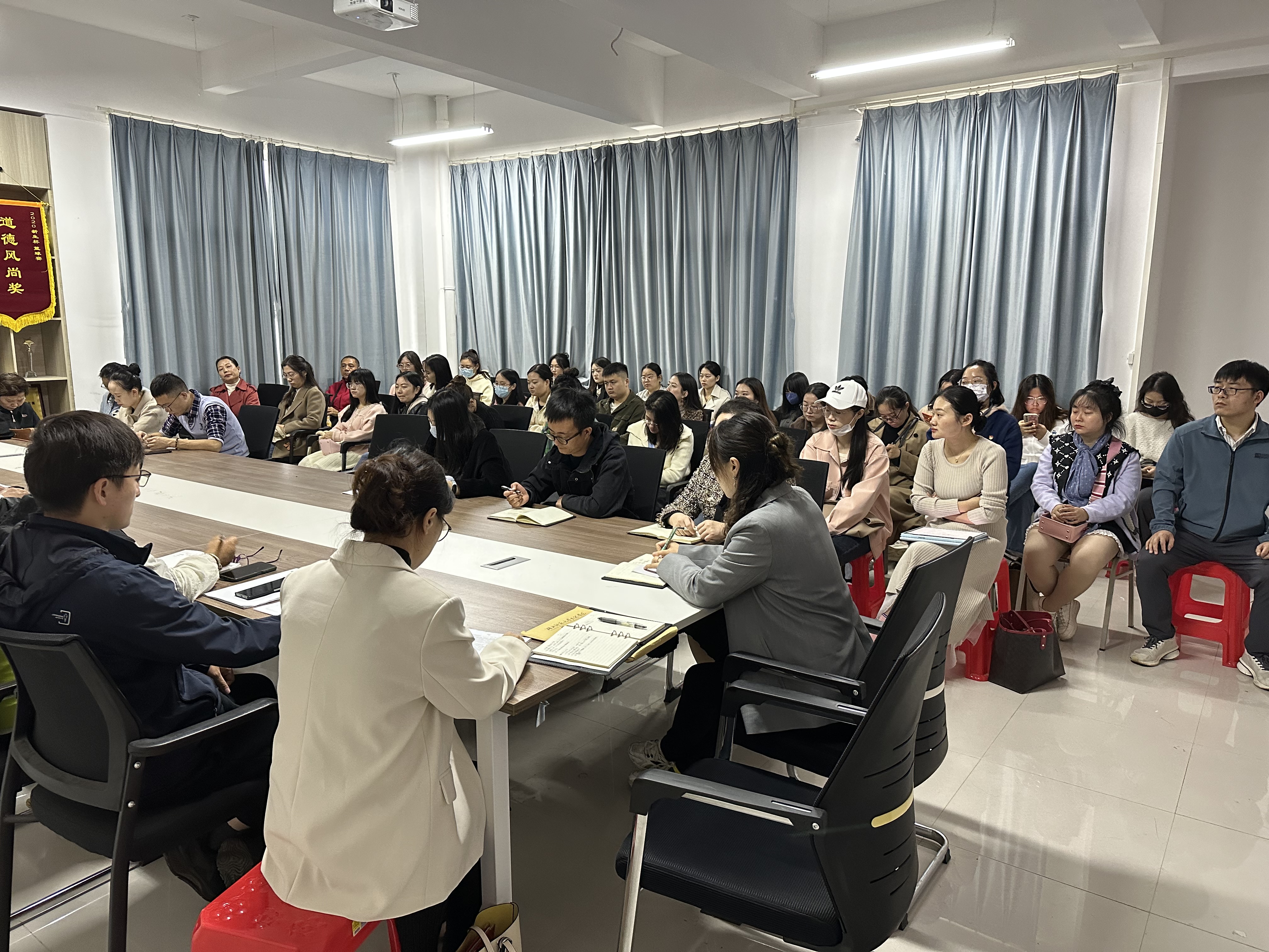 2023年11月9日中午12:00,教育与艺术学部在1号实验楼414会议室召开了全体教职工期中工作会议,参加此次会议的有学部主任王文、学部党总支书记李先华及教育与艺术学部全体教职工,本次会议主要包括以下几个议程:1.开展全体教职工政治理论学习,教工党支部书记汤澜和学生党支部书记尹誉霖领学;2.李先华书记补充强调党建工作和学生安全等相关工作;3.王文主任对期中教学检查事宜进行总结,并强调毕业论文、教师集体活动和教科研项目等工作的重要性;4.各教研室开展教研活动。