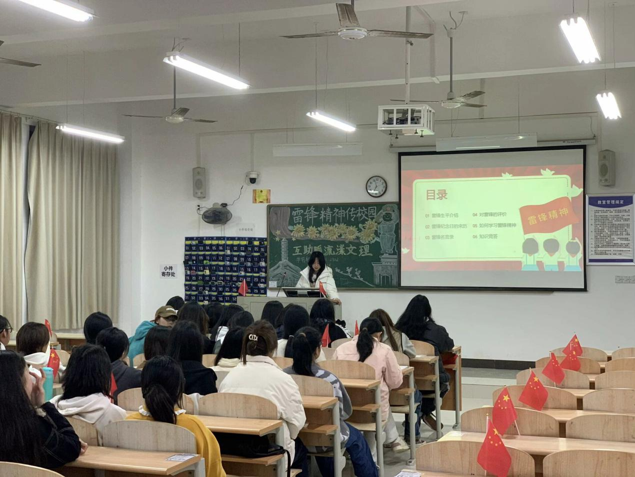 在团日活动中,各专业班级以集体奏唱团歌有序开展,通过制作黑板板画、紧紧围绕“雷锋精神传校园,互助暖流漾文理”为主题的PPT、观看学习视频、谈心得体会等多种形式,诠释了雷锋精神真正的内涵,使同学们体会到雷锋精神就是助人为乐、服务人民的奉献精神;干一行爱一行、专一行精一行的敬业精神;锐意进取、自强不息的创新精神;艰苦奋斗、勤俭节约的创业精神此次团日活动在严肃活泼、紧张有序地的氛围中取得圆满成功。