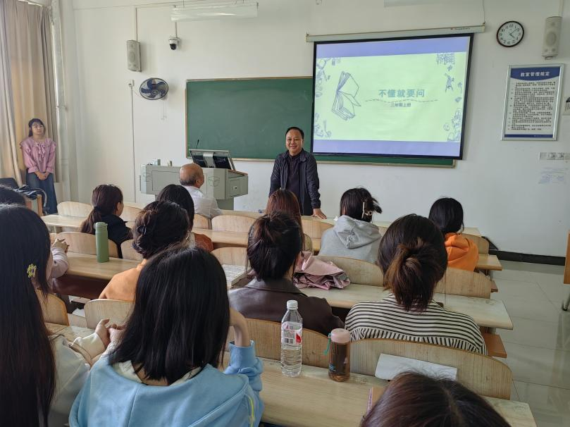 2024年4月2日下午16:10,教育与艺术学部主任王文和党总支书记李先华带领全体辅导员前往小学教育2202班的课堂,查看“课前十分钟”课前导入练习的状况。金凤源、田畅、郭诗雨、舒琼四名同学精心准备,与台下同学积极互动。王文主任肯定了四名同学的表现,并在表情配合内容的表达、讲话要结合文本做到抑扬顿挫等方向提出了中肯的指导意见,同时结合小学教育的就业态势和本年度的考研状况,希望同学们可以把握每一次表达和练习的机会,不断锻炼提升自我表达能力和专业素养。