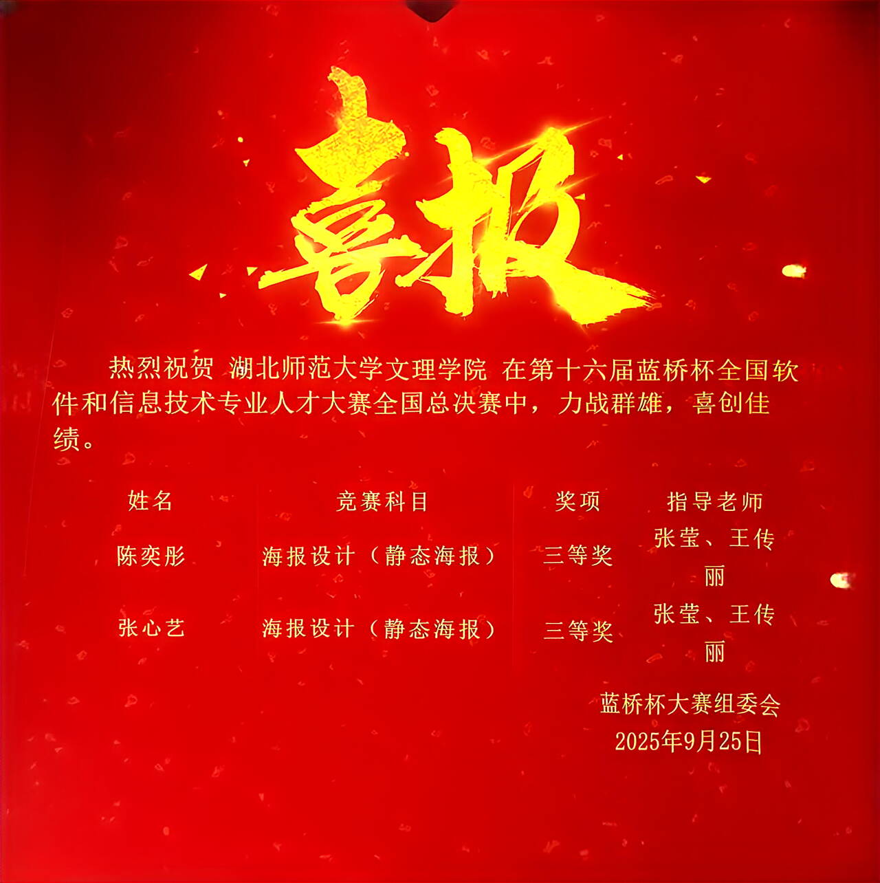 近日,第十六届“蓝桥杯”全国软件和信息专业技术人才大赛全国总决赛落下帷幕。mksports在线登录_mk(中国)一站式服务体育艺术与教育学院美术专任教师张莹、王传丽指导学生参赛,在视觉艺术设计平面设计赛道中脱颖而出,斩获全国三等奖,不仅为学校赢得荣誉,更一举突破本校在该赛事中的学生获奖历史记录,书写了艺术与技术融合育人的崭新篇章。